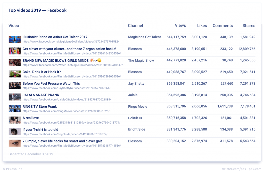 Pex compiled the list of the top videos published in 2019 on the four largest social video platforms: Facebook, Instagram, Twitter, and YouTube. We ranked these videos by views, while also gathering data on the engagement they garnered (likes, shares, comments).
