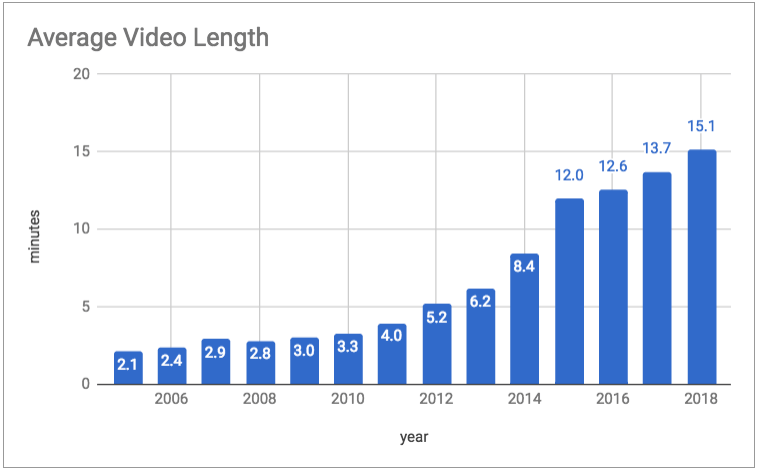 Not only are YouTube users uploading more videos than ever, but their videos are getting longer as well. As the graph below illustrates, the average YouTube video length has increased from just over 2 minutes in 2005 to over 15 minutes today.