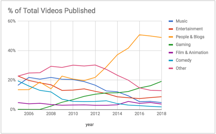 The rise of the ‘People & Blogs’ category began in 2013, and grew to account for over half of all YouTube uploads in 2016. The ‘Gaming’ category has steadily been on the rise since its inception in 2007 and overtook the ‘Music’ category in 2015 for the 2nd most videos uploaded that year. Thus far in 2018 ‘Gaming’ has accounted for nearly 1 in 5 videos uploaded to YouTube.