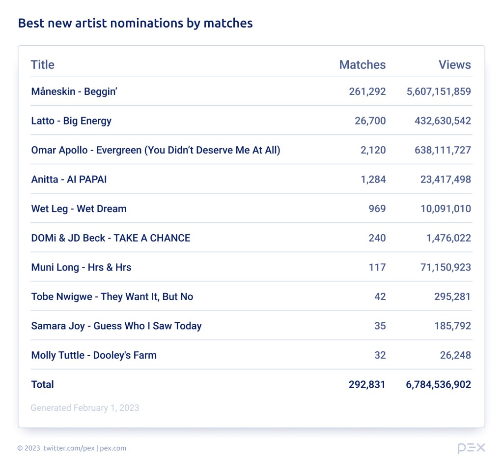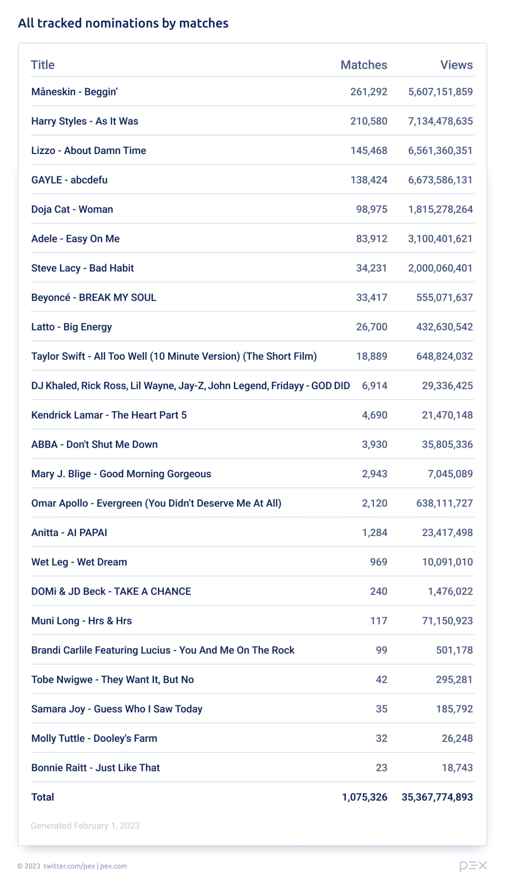 Each member of the Recording Academy is only allowed to vote within their area of expertise. Well at Pex, our area of expertise is tracking audiovisual content across digital platforms, including the top social media sites. Last year we shared which Grammy winners fared best across the 25+ platforms we track, and saw that no 2022 award winners were also able to claim the Pex annual award title of Most Copied Song. Deloitte may do the official calculations for the Recording Academy, but Pex does the official calculations for social media.