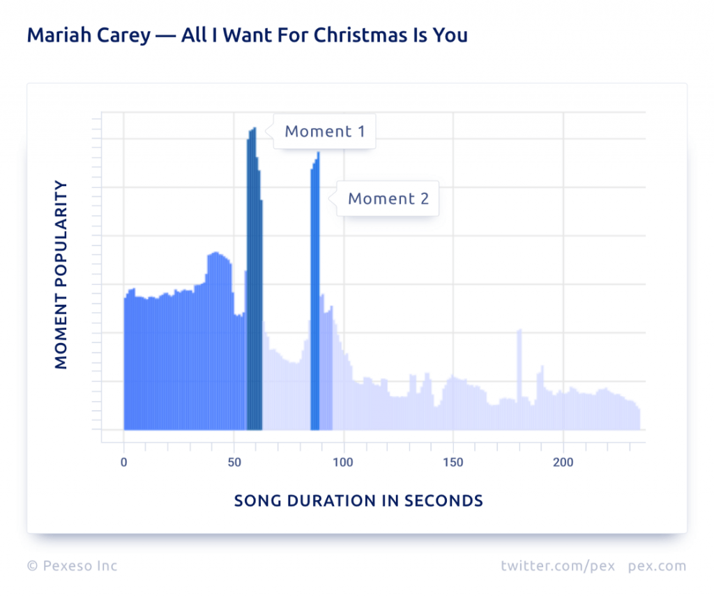 Moment 2 is the next spike in popularity which leads up to the hook of the song saying “I just want you for my own, more than you could ever know,” “make my wish come true, all I want for Christmas is you!”