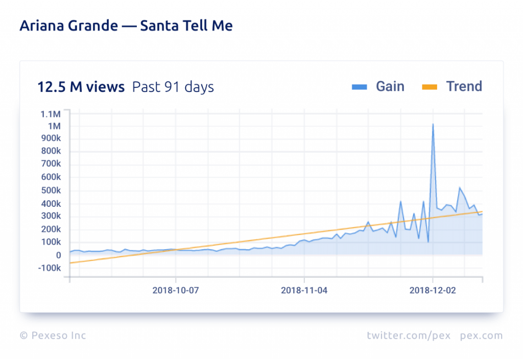 We decided to dig deeper into one of the most popular songs this time of year?-?Mariah Carey’s smash hit “All I Want For Christmas Is You“. The YouTube version of the song has earned over 492 million views to date, but that stat only tells part of the story. Pex found over 242,000 copies uploaded to social platforms around the net which have generated an additional 1.6 billion views!